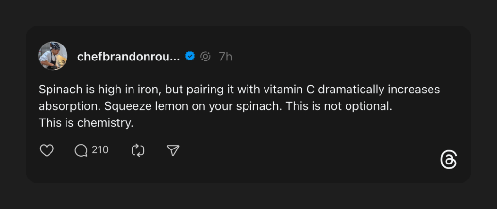 More: What Cleveland Clinic says about this: “Be sure to pair non-heme iron foods with vitamin C to increase the absorption of iron. Vitamin C is found in citrus fruits (lemon, lime, orange, kiwi and grapefruit), strawberries, tomatoes, broccoli and spinach.”